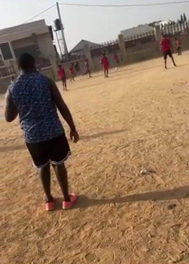 several individuals playing soccer on a sand lot on a sunny day. The camera is positioned behind an individual wearing a blue and white patterned sleeveless shirt, black shorts with white trim, and pink sneakers. This person appears to be watching the soccer game. In the background, several people, most wearing red shirts, are actively playing soccer on a light brown, sandy field. A few other individuals are positioned around the field, seemingly observing the game. A stone wall and some buildings are visible in the background, as well as a utility pole with wires. The overall scene suggests a casual, informal soccer game in a residential area.