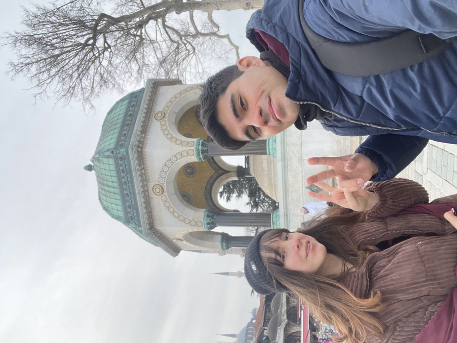 The image displays two individuals posing for a photograph in Sultanahmet Square, Istanbul, Turkey