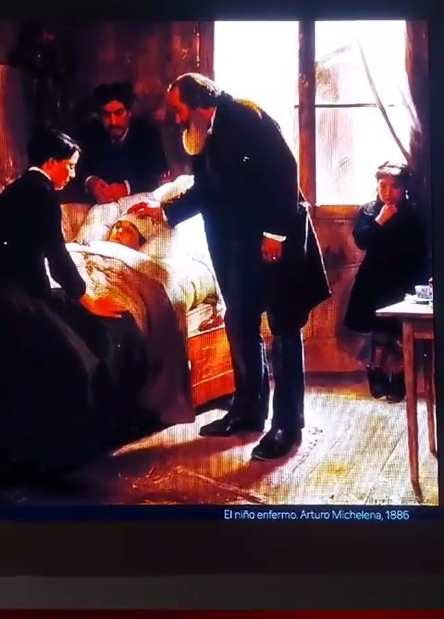 wall in an art gallery. Two framed paintings are hanging on the wall. The painting on the right is titled "El nino enfermo. Arturo Michelena, 1886." The painting shows a child lying in bed with two adults next to them and a woman and another man in the background. The painting on the left is of a man on a horse. A red rope barrier is placed in front of the wall.