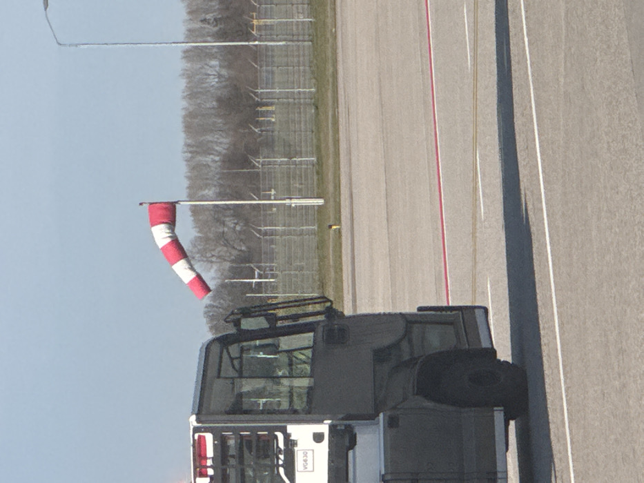 The image depicts an aerial-side view at Eindhoven Airport, Netherlands. In the left foreground, a dark grey and white ground support vehicle, marked "VG630," is partially visible on a paved surface, facing right. A red and white striped windsock is prominently displayed on a pole in the mid-ground, fully extended horizontally to the left, indicating active wind. Beyond the paved area, a security fence, topped with barbed wire, spans the background, separating the apron from a distant line of bare deciduous trees. The scene is illuminated by clear sunlight, casting long shadows on the paved tarmac, which features distinct red and white painted lines. A tall, slender light pole is visible on the far right. No individuals are present in the image.