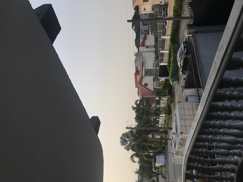 A cityscape is viewed from an elevated perspective. A large building section on the left contrasts with the distant row of houses and trees. A street runs between the viewer's position and the houses, complete with a parked car and some greenery. Power lines stretch along the street. The sky is hazy, suggesting either a cloudy day or smog. Ornate railings are visible on the right side, indicating a balcony or terrace.