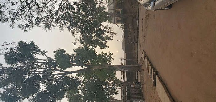 The image depicts an outdoor scene in an unspecified city and state, under a pale sky with a low, visible sun disc. The ground is composed of reddish-brown dirt. A meandering path constructed from rectangular, light-colored paving slabs runs along the left side of the dirt path, extending from the foreground into the midground. Two large trees with green foliage stand prominently in the midground, with additional trees visible in the background. To the far left, a rustic structure made of vertical wooden slats is present. An individual wearing a light-colored garment is partially visible near this wooden structure. In the midground, a dark-colored wall stretches horizontally, bearing discernible graffiti that includes the phrase "Social Miracle." Behind this wall, structures with light-colored walls and dark, pitched roofs are visible. A small, distant figure appears to be walking on the dirt path to the right of the central trees. The front fender and wheel of a light-colored vehicle are visible on the far right edge of the frame.