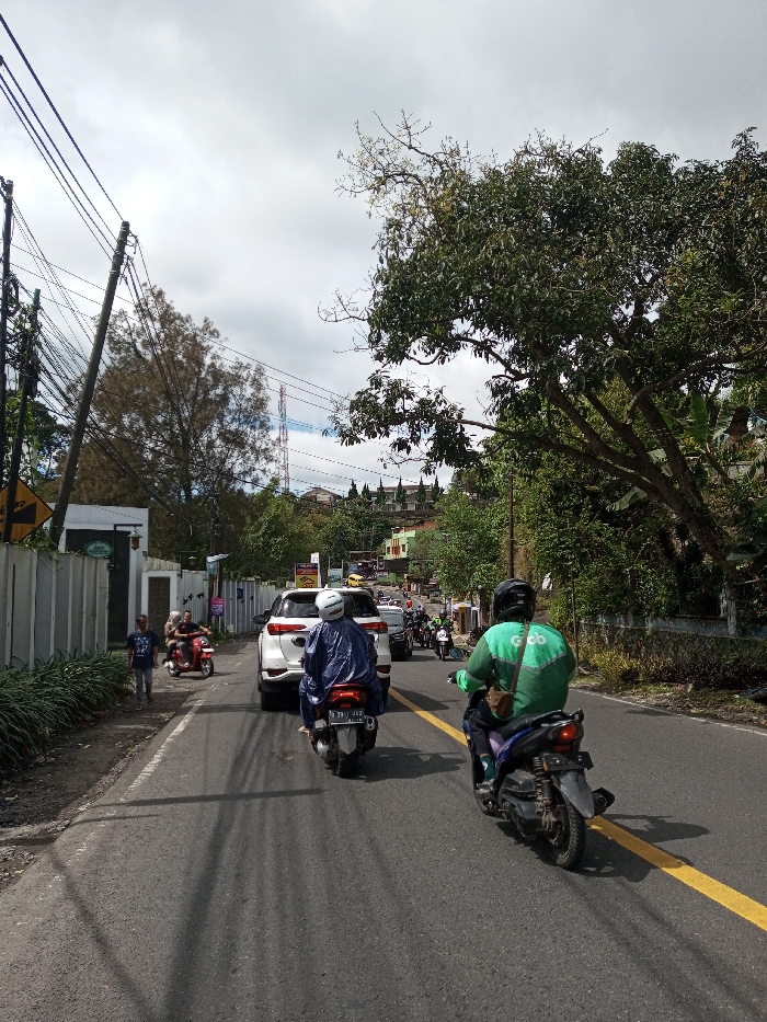 The image depicts a street scene in Taohom, Laos, under an overcast sky. The view is from a low angle, looking forward down an asphalt road marked with a solid yellow line on the right. In the immediate foreground, two individuals are riding motorcycles, both viewed from behind. The rider on the right wears a green long-sleeved shirt with a "Grab" logo, a black helmet, and dark pants, operating a dark-colored scooter. The rider to the left wears a blue rain poncho and a white helmet, operating a similar dark scooter, positioned behind a white SUV. The white SUV, likely a Toyota Fortuner, is centrally located on the road, queuing with other vehicles further down. On the left side of the road, a paved shoulder or narrow sidewalk runs parallel to a light-colored concrete fence. Green shrubbery grows along the base of this fence. Two individuals are walking on the sidewalk; one in a blue shirt is clearly visible, while the other is partially obscured. Further back on the left, a red scooter carries two passengers, appearing to be stopped or moving slowly near the road edge. The left side of the scene features multiple utility poles densely strung with electrical and communication wires. Behind these, a sparse-leafed tree stands, and in the distance, a red and white communication tower rises above other structures. A yellow diamond-shaped road sign is partially visible on the far left. The right side of the road is bordered by dense green foliage and large trees, with parts of buildings featuring distinctive architectural spires visible through the leaves on an elevated terrain. The overall environment suggests an urban or semi-urban setting with active traffic and pedestrian movement.