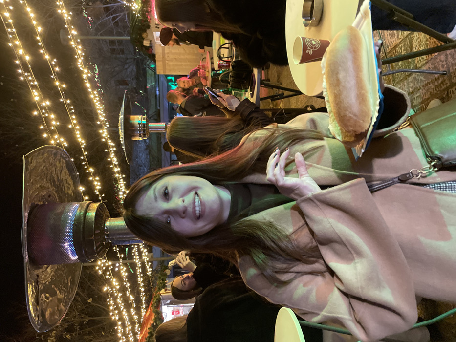 A young woman with long brown hair smiles at the camera while seated outdoors. She wears a tan coat and has a sandwich on a plate beside her. In the background, strands of lights illuminate the scene. Other people are seated at tables, and a patio heater stands nearby. The scene appears lively, with a casual, festive atmosphere.