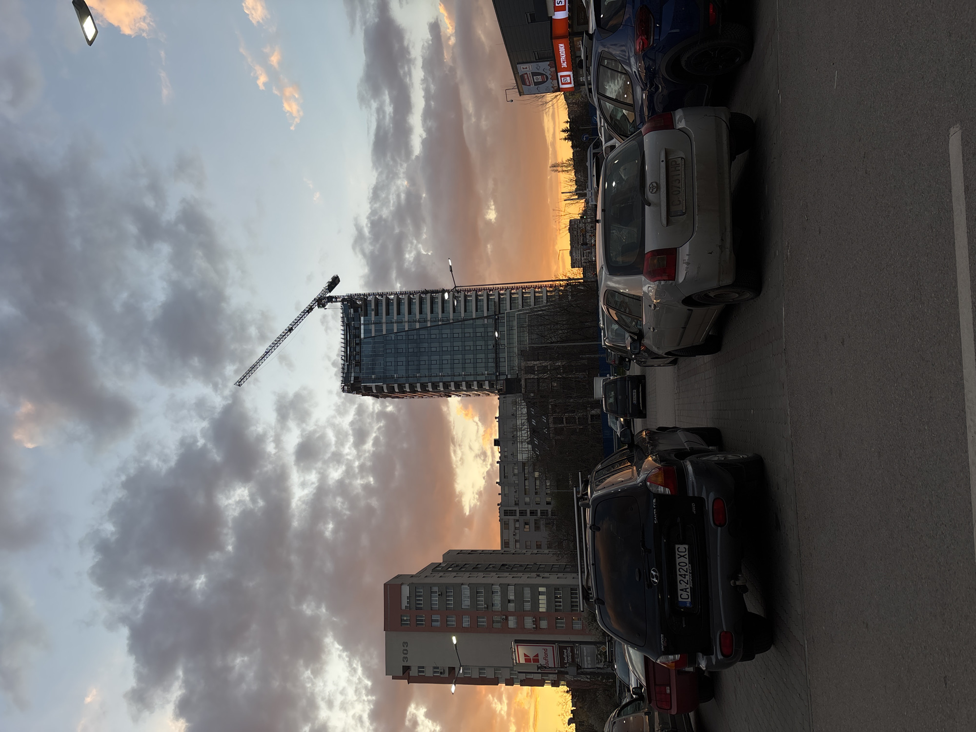 street scene in Sofia, Bulgaria, at sunset. The sky is filled with dramatic clouds, tinted with orange and pink from the setting sun. On the left, a modern high-rise building under construction is visible, complete with a construction crane. Adjacent to it are residential buildings. A Kaufland supermarket is also visible with the number 303. On the right side of the image, cars are parked along the side of the road. The license plates are visible, including "CA 2420 XC" on a black Hyundai Santa Fe and "C.0731HP" on a light-colored Toyota. A street light is visible at the top left of the frame.