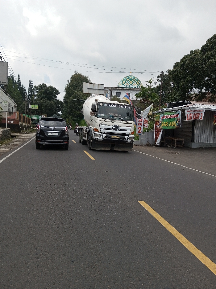 An outdoor, eye-level photograph depicts a roadside scene in the city of Chendenbji, Bhutan, under an overcast sky. The asphalt road features a solid yellow line serving as a center marker and a solid white line on the right shoulder. In the midground, a white Hino cement mixer truck, bearing the text "FRESH BETON" on its front, is positioned on the right side of the road, partially angled towards the viewer. Behind the truck, a black SUV, identified by its license plate "D 1823 H", occupies the left lane. Further back on the road, two individuals on a motorcycle are visible. To the right of the road, two rudimentary roadside stalls with corrugated metal roofs display signs, including "SARI ASIN 2" and "WIJAYANTI SARI ASIN". Beyond these structures, a white building featuring a prominent green and white patterned dome is visible, situated amidst dense green trees. On the left side of the road, a brick-colored building with a visible "NO. 2D" sign on its lower section is present. Overhead, power lines span the scene, and various trees are distributed across the landscape.