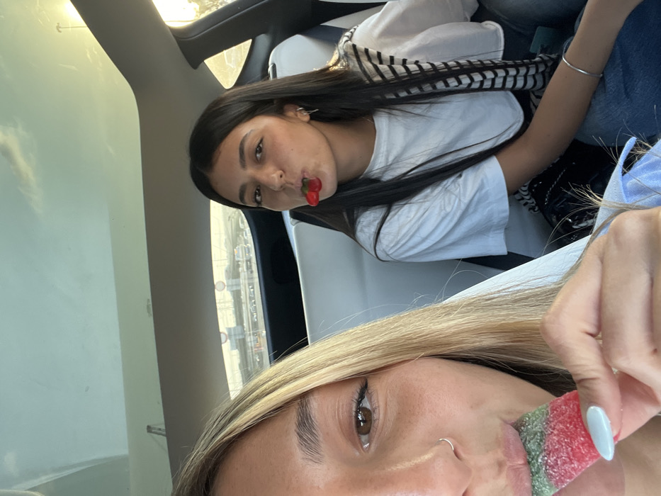 Two young women are depicted inside a passenger vehicle, located in the city of Rosh Haayin, Israel. The image is framed from a close-up, slightly low-angle perspective. In the immediate foreground, the right side of a young woman's face is visible, featuring long blonde hair, a brown eye, and a silver nose ring. Her hand, with light blue nail polish, holds a multi-colored, sugar-coated sour gummy candy (red, pink, and green segments) which she is consuming. Behind her, seated in the vehicle, is a second young woman with long dark hair, wearing a white short-sleeved t-shirt and blue jeans. A black and white striped garment is draped over her left shoulder. She has two red, cherry-shaped gummy candies held between her lips and is looking towards the camera. A silver bracelet is visible on her left wrist, and she wears small hoop earrings. The vehicle's interior features light-colored seating elements and a panoramic sunroof. Through the rear window, multi-lane road traffic and road signs are visible under daylight conditions.
