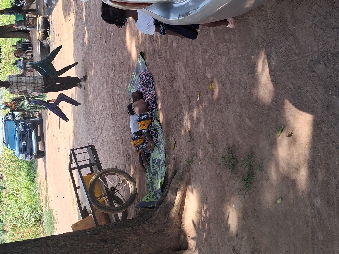 The image displays an outdoor scene in Wukari, Nigeria, on an unpaved reddish-brown dirt surface. In the foreground, beneath a large tree providing shade, two young children lie prone on patterned mats, appearing to rest or sleep. One child wears white shorts with yellow patterns, and the other wears yellow shorts with black patterns. To the far right, a small child, wearing a white top and dark lower garment, stands partially visible next to a silver vehicle. In the midground, a wooden two-wheeled cart with a metal frame is parked near the tree trunk. A man, dressed in a plaid shirt and dark trousers, is seen walking from the background towards the foreground, carrying one purple and one green plastic chair upside down. A woman in patterned clothing is partially visible behind him. Further in the background, a dark-colored SUV is parked on a dirt road, facing left. Behind the vehicle, an area of dense green vegetation is visible. To the right of the SUV, a group of individuals are seated under what appears to be a tree or shaded structure. Large cooking pots or vessels are visible on the ground near these individuals. Tree shadows are cast across the dirt ground, consistent with daytime conditions.