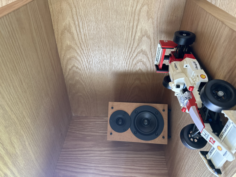 Inside a wooden cabinet, a two-way speaker sits to the left. The speaker has a larger woofer and a smaller tweeter. A white, red, and black Lego McLaren Formula 1 car is to the right of the speaker. The car has the number 12 and the Shell logo. The inside of the cabinet is light brown with a wood grain pattern.