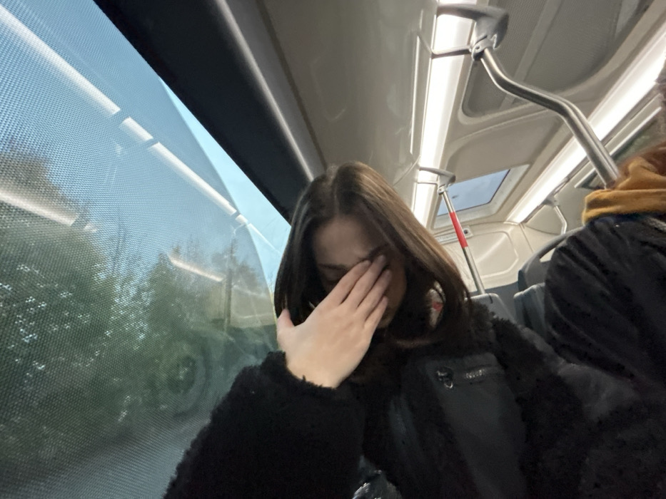 - "A female subject with long, dark brown hair is depicted seated within a public transport vehicle, presumed to be a tram or modern bus, operating in Hoenheim, France" by FM-vVQbp1, licensed under CC BY 4.0