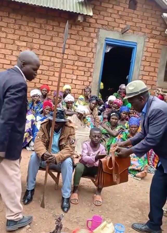 The video depicts a gathering of people in front of a brick building with a tin roof. A man in a dark suit and hat is holding a brown briefcase, interacting with a child sitting on a small chair. Another man sits to the child's left holding a spear. A seated group of women wearing colorful clothing and head coverings sits behind the child, observing the interaction. On the ground in front of the child are several items, including a plate with what appears to be grilled meat, a pink mug, and a white container. The scene appears to be taking place outdoors in a rural setting.