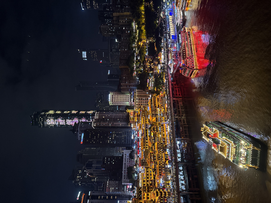 This detailed nighttime image captures an urban waterscape within the vicinity of 江北城街道, Chongqing, China. The scene features a broad river in the foreground and mid-ground, densely populated by multiple vessels and flanked by a brightly illuminated cityscape. Two prominent multi-decked tourist boats are visible on the river. The boat in the lower-left is primarily illuminated with green and gold lights, exhibiting traditional tiered architecture, and appears to be moving towards the right. Another large boat in the mid-right is predominantly lit with red lights, also featuring traditional design, and is positioned either stationary or moving slowly. Reflections of these and other lights are visible on the dark, murky river surface. Several smaller, less distinct boats or docking structures are also discernible along the riverbank. The mid-ground of the image is dominated by the multi-tiered Hongyadong complex, constructed into a hillside. This traditional-style architecture is extensively illuminated with warm orange and yellow lights across its numerous levels, creating a vibrant glow. A multi-lane roadway or bridge runs horizontally in front of the complex, parallel to the river, showing streaks of vehicle lights and clusters of pedestrian lights. In the background, a dense cluster of modern skyscrapers forms a towering skyline against the dark night sky. The tallest skyscraper, centrally positioned towards the upper-mid section, features a large, vertically oriented digital display exhibiting bright, colorful Chinese characters, including "30周年" (30th Anniversary), and dynamic patterns. Other skyscrapers display various internal and external lighting patterns. High in the upper-right sky, three faint, small lights are visible in a linear arrangement, possibly indicating aircraft or drones. The overall environment is one of bustling urban activity, highly illuminated under a dark, clear sky.