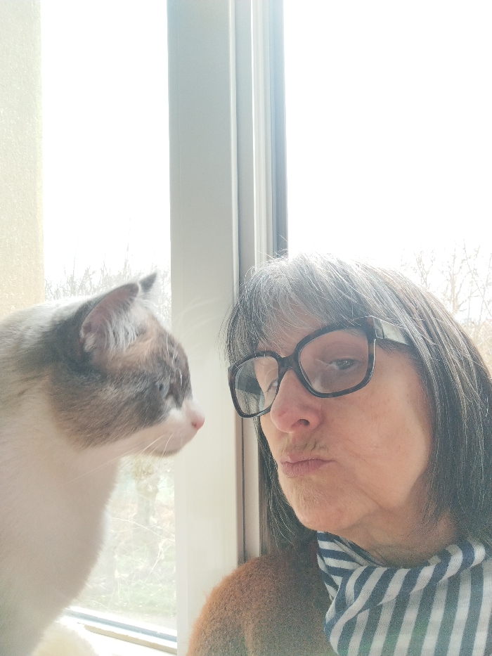 The scene depicts an indoor environment in Montélimar, France, featuring a woman and a cat positioned near a brightly lit window. A middle-aged or older woman occupies the right side of the frame, facing generally towards the viewer. She has dark hair with visible graying, styled with bangs, and wears large, dark-framed glasses. Her mouth is pursed in a distinct "fish face" expression. She is dressed in a brown, textured garment, possibly a sweater, and a blue and white striped scarf around her neck. To the left of the woman, a domestic cat with colorpoint markings (white body with grayish-brown ears and facial features) is shown in profile. The cat's blue eyes are subtly discernible. It appears to be sitting on a surface, looking towards the right side of the frame and out the window, rather than directly at the woman or the camera. The background is dominated by a large window, providing significant natural light that overexposes the view outside. Through the bright, blurred glass, outlines of bare tree branches are visible, suggesting an exterior with sparse vegetation. A light-colored wall or window frame is visible on the far left, and the interior window frame is white. The interaction between the woman and the cat is passive; the woman is engaging with the camera while the cat observes the exterior.