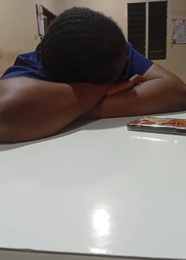 A person is sleeping on a white table with their head down and arms crossed. A phone is next to them on the table. There is a window with blinds and a calendar or sign on the wall behind the person. The room appears to be indoors with yellowish lighting.