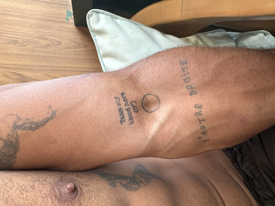 A close-up captures a person's arm and chest. The skin tone is tanned. The arm features multiple tattoos, including a depiction of a figure, the phrase "Take my blood here (or)", a circle, and "L'AUTRE DROITE" written vertically. The chest also displays a tattoo of a figure and a nipple. The arm rests on the chest, with a blurred wooden chair and pillow visible in the background. The overall scene has a casual, intimate feel.
