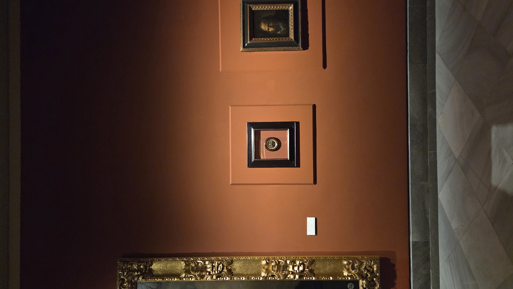 The image displays an interior view of a gallery within the Museo de Bellas Artes de Sevilla, Spain. The walls are painted a uniform terracotta or burnt orange color. The floor consists of large, light-colored square marble tiles laid in a diagonal, checkered pattern, bordered by a dark grey baseboard. Three framed artworks are visible on the wall. On the far left, a portion of a large, highly ornate gold-gilded frame is visible, showing intricate decorative carvings. Centrally, a small, circular miniature portrait is showcased within a black rectangular frame, which is mounted on a larger, square, terracotta-colored panel protruding from the wall. Below and slightly to the left of this central display, a small white rectangular informational plaque is affixed to the wall. To the right, another rectangular portrait is displayed in a dark frame with potential gold accents. This painting depicts an older man with a beard, facing to the viewer's left, rendered in a classical style against a dark background. This artwork is also mounted on a square panel of the same wall color, subtly protruding. No people or actions are depicted in the scene; it is a static display of museum exhibits.