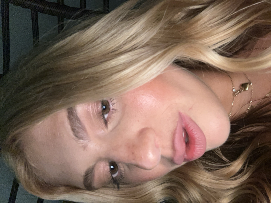 A woman with light skin and blonde wavy hair is close to the camera. Her eyes are brown, and she has freckles on her nose. She is wearing a gold necklace. The background includes a dark, textured surface. The image is oriented sideways.