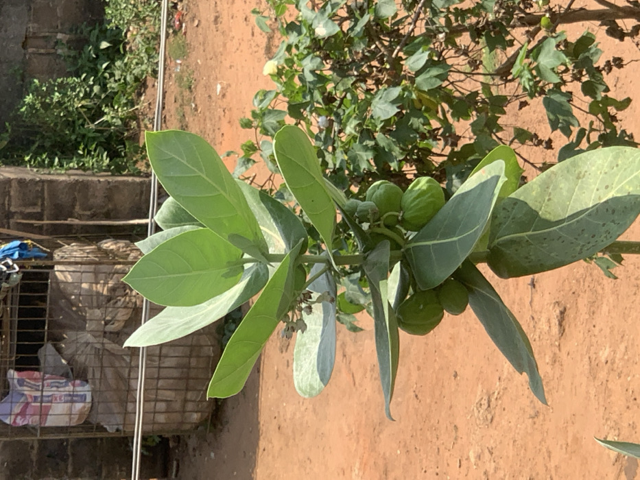 - "A Calotropis gigantea plant, characterized by large, pale green, ovate leaves and multiple clusters of immature, green, bulbous fruits, stands prominently in the foreground" by FM-8xdlM2, licensed under CC BY 4.0