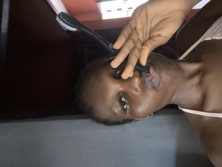 The image, captured indoors in Oba-Aboji, Nigeria, presents a close-up, eye-level view of an individual. The person, appearing to be an adult female with dark skin and short dark hair, faces the camera with a slight head tilt to her right. Her lips are pursed into a pouting expression. She wears a light-colored, ribbed top with thin straps. A small black stud is present in her left earlobe. She holds a black toothbrush with white bristles vertically. The lower end of the toothbrush is positioned between her pursed lips, while the shaft extends upward past her right eye, supported by her right hand. Her right hand is raised, with fingers partially splayed, grasping the toothbrush handle near her face, partially obscuring her right eye. The background consists of a plain grey wall on the left side of the frame and a dark brown surface, likely a door or cabinet, on the right. A partial view of a window or opening on the far right reveals a lighter, possibly orange-toned exterior wall and white vertical window components, indicating an external light source.