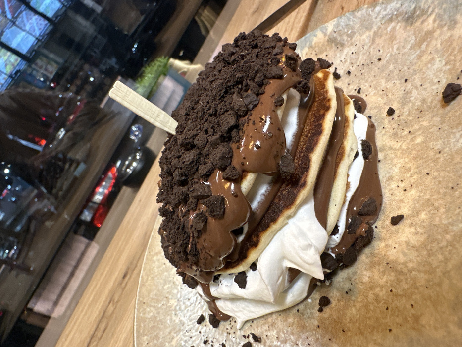 A close-up, slightly elevated shot captures a multi-layered pancake stack served on an irregular, light brown textured surface, possibly a plate or board, in a commercial establishment in Veliko Tarnovo, Bulgaria. The stack comprises at least three distinct pancakes, interleaved with generous portions of white whipped topping and a thick dark brown chocolate spread. The entire top surface of the uppermost pancake is heavily coated with coarse dark brown cookie crumbs, which are also scattered partially onto the serving surface. A slender, light-colored pick or skewer is vertically inserted into the center of the stack. In the blurred background, a large window reflects the nighttime exterior, showcasing red tail lights of vehicles, suggesting a street scene. A wooden surface is visible beneath the window, and a faint green plant in a white container can be discerned on the right side of the background. No individuals are visible in the frame; the scene implies preparation for or an ongoing act of consumption.