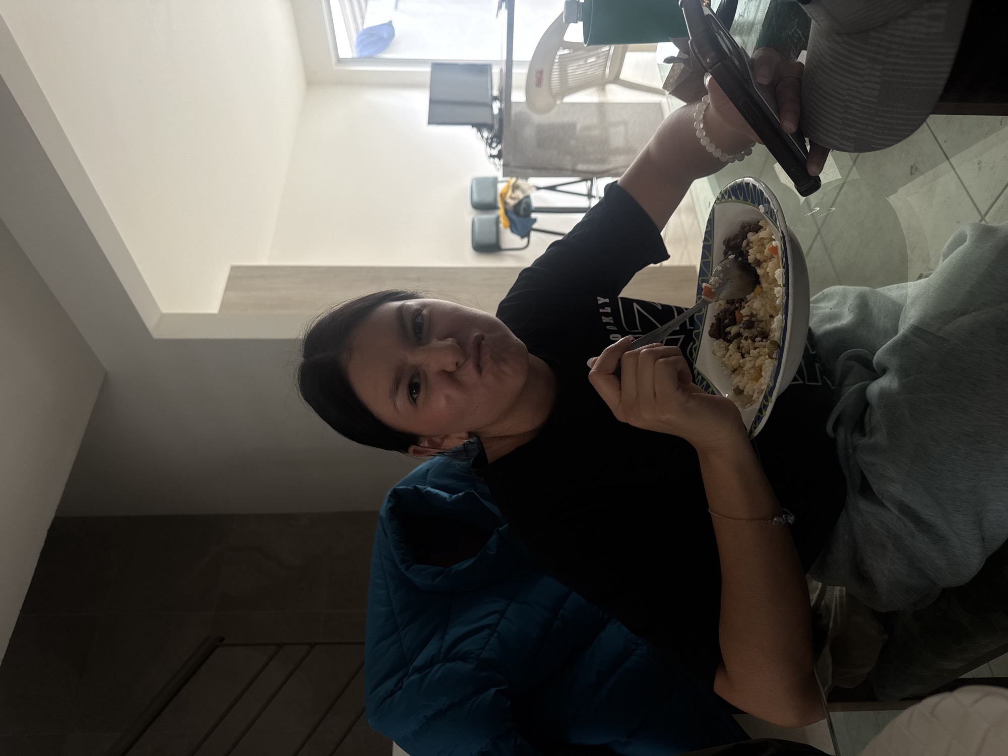 This indoor scene is located within a residential setting in San Francisco Ocotlán (Ocotlán), Mexico, characterized by light-colored walls, tiled flooring, and bright natural light from a window on the right. In the foreground, a young female with dark hair, wearing a black graphic t-shirt and light grey pants, is seated at a clear glass table. She wears a gold chain necklace and both a white beaded bracelet on her right wrist and a gold bracelet on her left. She holds a metal fork, which rests in a white bowl containing a meal of rice, ground meat, and mixed vegetables. Her facial expression is a playful grimace, with pursed lips and a wrinkled nose. A blue quilted jacket is draped over her left shoulder or the back of her chair. To her right, another individual's right forearm and hand are visible, holding a black smartphone. A dark green cup or bottle also sits on the glass table. The background features a kitchen or bar area with a light-colored counter, supporting a flat-screen television with visible cables. Two dark bar stools, one with a yellow cloth draped over it, are positioned behind the counter. Further right, a white slatted chair is visible near a large window, from which a blue cloth or garment hangs. To the left, a dark brown wall with horizontal paneling or grooves is present.