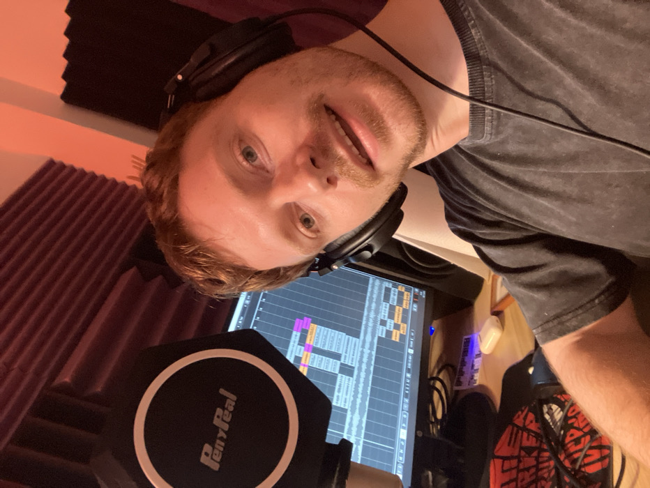 A light-skinned man wearing headphones and a gray t-shirt looks at the camera while in front of a computer. The computer screen displays music editing software. A black microphone with a circular pop filter is positioned in front of him. Soundproofing foam panels line the walls in the background, some are black, and some are purple. A warm, possibly orange, light casts on the scene. Cables, accessories, and other electronic equipment are visible on the desk around the computer.