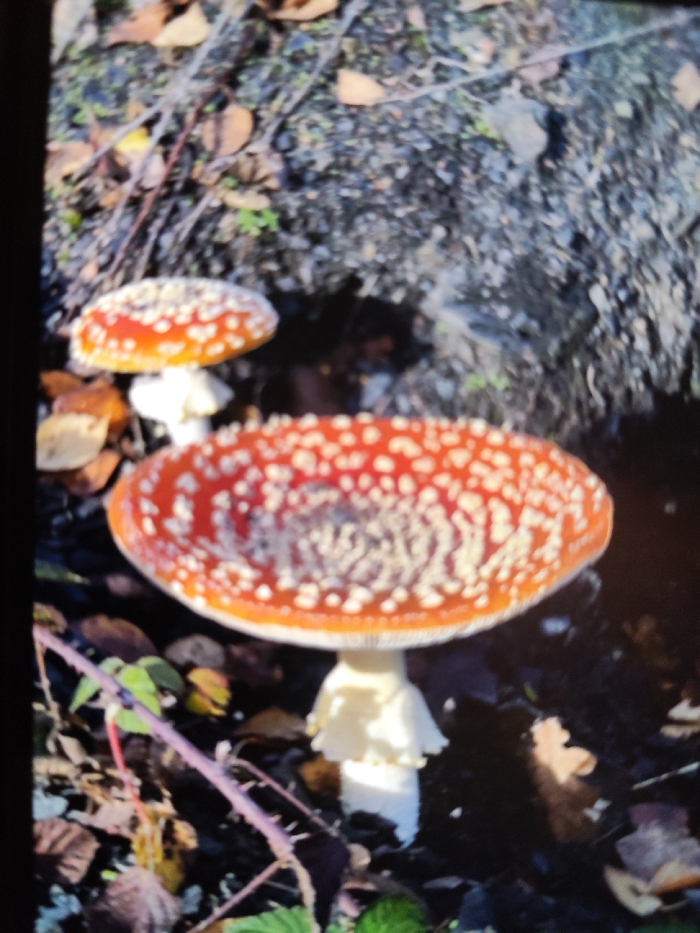 - "Two toadstools dominate the image, their red caps speckled with white warts" by FM-mYi593, licensed under CC BY 4.0