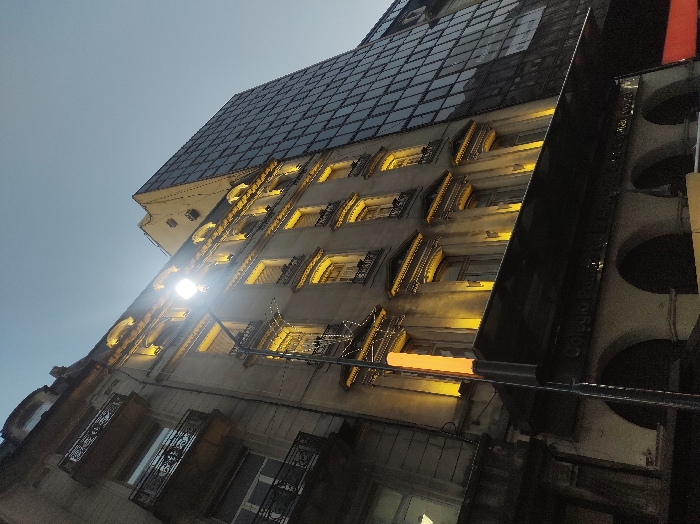 An upward view of two buildings. The older building on the left has ornate window frames and multiple stories. The newer building to its right features a grid-like glass facade. A street light illuminates the older structure, casting yellow light. A dark, vertical structure with circular vents is partially visible on the right. The sky is a pale blue.