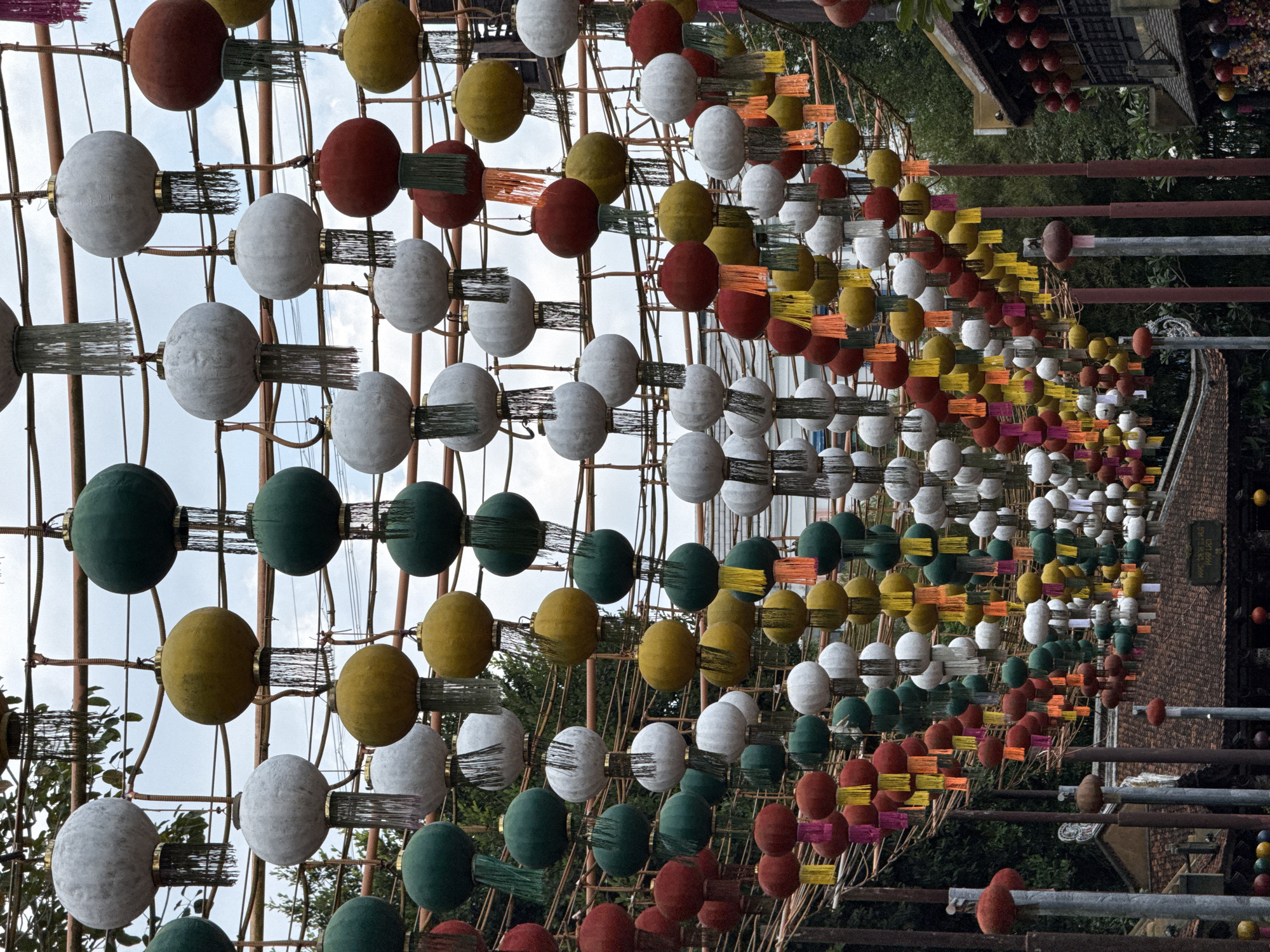 The image depicts an outdoor pathway in Phú Quốc, Vietnam, beneath an extensive overhead canopy of suspended spherical lanterns. Hundreds of lanterns are visible, predominantly colored white, dark green, yellow, and red, arranged in rows and columns. Each lantern features a hanging tassel, with colors including dark green, white, yellow, red, orange, and pink. The lanterns are supported by an overhead grid-like framework composed of slender, tubular elements, likely bamboo or wood, interwoven with visible cords or wires. In the background and lower sections of the image, traditional-style buildings with dark, tiled roofs are visible, one featuring a sign with Vietnamese text, "PHÚ LÁNG". Vertical support poles, some gray and some dark red-brown, rise from the ground to the overhead structure. Green foliage from trees is present on the sides and in the background. The sky, visible through gaps in the lantern canopy, appears overcast. No individuals or dynamic actions are present in the scene.