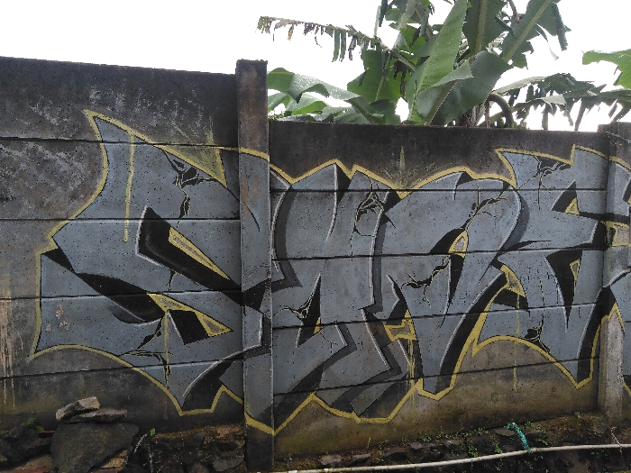 The image displays a weathered concrete boundary wall in Hafjell, Norway, extensively covered with graffiti art. The wall is constructed from segmented grey concrete panels, exhibiting visible horizontal seams and a central vertical concrete support pillar that divides the artwork. The graffiti, rendered in a stylized block or bubble letter font, predominantly features a grey/silver fill with stark black outlines and yellow highlights/drop shadows. The letters are stylized with painted cracks, creating a distressed or shattered visual effect, and appear to spell "SMASH". The concrete surface of the wall shows signs of weathering, including dirt and grime accumulation, particularly near the base. Above the wall, dense, large-leafed green vegetation, consistent with banana plants, is clearly visible, extending upwards against an overcast bright white sky. Below the wall, the immediate foreground consists of dark soil, scattered rocks, and sparse green foliage. A light-colored pipe or conduit runs horizontally along the base of the wall, with a piece of green material, possibly netting or rope, visible nearby. There are no individuals, actions, or direct interactions depicted in the scene.