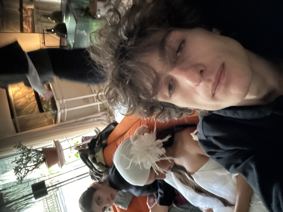 This image captures an indoor scene in Vincennes, France, featuring four individuals within a living area. In the immediate foreground, a male with dark, curly hair and a light complexion is partially visible, looking directly towards the camera. He wears a dark, collared top. Behind him, to the left, a female with dark hair is seated on an orange sofa, her gaze directed towards the camera. She wears a dark top and a grey sleeve or glove on her left arm, with a patterned blanket draped behind her. Adjacent to her, a second female is seated on the same sofa, her head tilted downwards, away from the camera. She is clad in a white, off-the-shoulder garment and a light-colored headpiece adorned with a white, floral or feather-like embellishment. The background features a large window on the left, revealing outdoor foliage and a railing. A potted plant, possibly a jade plant, rests on a white stand next to a black floor lamp. To the right, two glass enclosures, resembling terrariums or aquariums, are displayed on white ornate stands. One contains green plants, and the other is illuminated from above by two black-shaded lamps. A blurry figure, dressed in dark clothing, is visible standing in the far background, appearing to be in motion behind these enclosures.