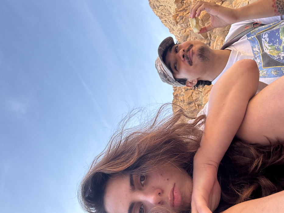 A low-angle shot features two people. A woman with long, wavy brown hair, fair skin, and defined features is in the foreground. Behind her, a man with a mustache and a baseball cap holds a piece of food, possibly fruit, in his hand. They are set against a backdrop of a clear blue sky and what appears to be a rocky cliff face. The man wears a white t-shirt, and his arm is across the woman’s body.