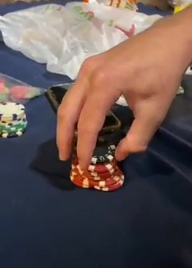A person is shown breaking up a stack of red and black poker chips on a dark blue tablecloth. The person uses one hand to hold the stack and then spreads the chips out with the other hand. Next to the chips on the tablecloth is a smartphone with a cracked screen. Several bags and other stacks of poker chips are also on the tablecloth. Two people can be seen standing in the background but are not the primary focus of the video.