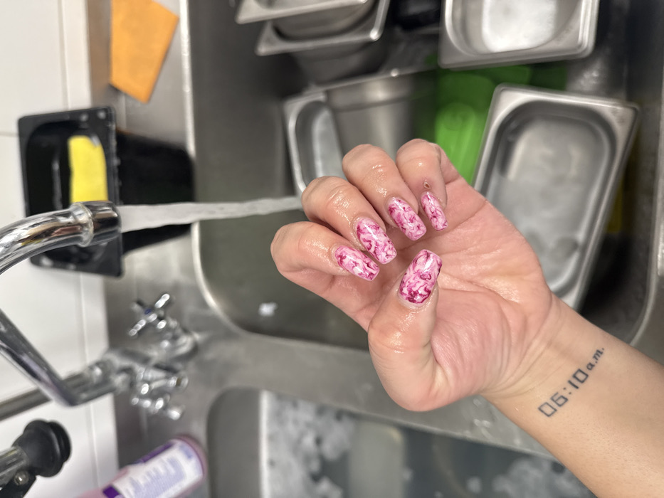 The image depicts a close-up view of a person's wet left hand positioned under running water in a commercial-style kitchen sink in Tsaratsovo, Bulgaria. The hand features coffin-shaped fingernails with a distinct pink and white marble-effect polish. On the inner left wrist, a tattoo displaying "06:10 a.m." in a digital font is visible. The immediate environment consists of a dual-basin stainless steel sink. Water streams from a chrome gooseneck faucet into the right basin, which contains several stainless steel food service pans and a green plastic mat. The left basin appears to hold soapy water. A purple plastic bottle, a black container with a yellow sponge, and an orange cloth are present on the sink's backsplash and counter area.