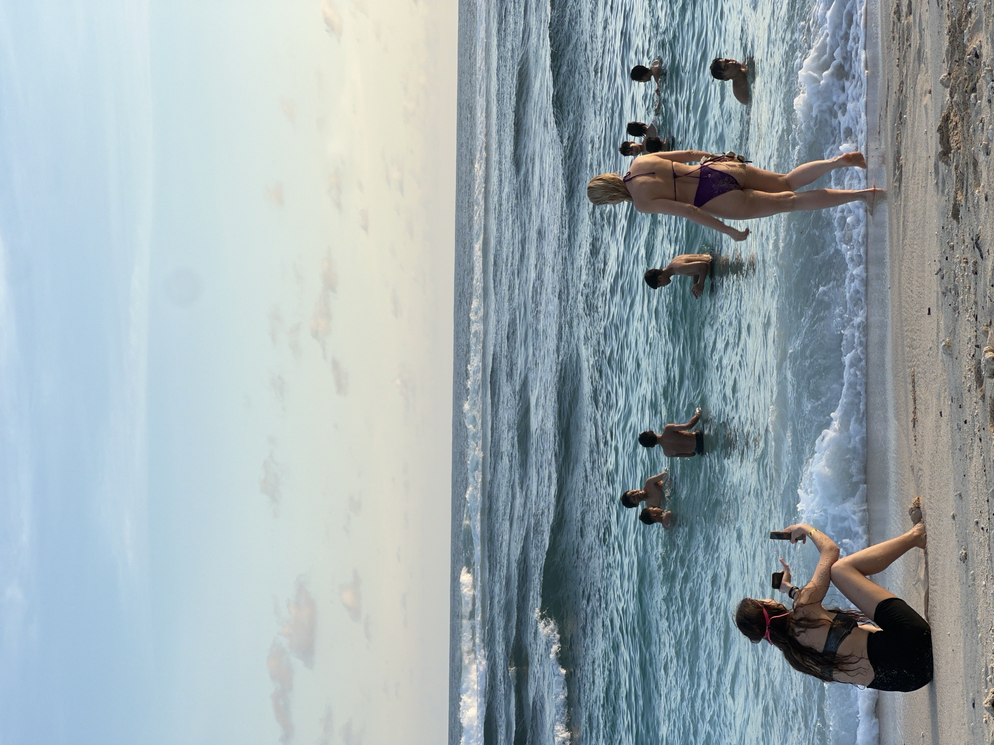 beach scene. The sky is visible in the left of the frame, transitioning from light blue to a beige color. A body of water with rolling waves occupies the central portion of the image. Several people are in the water. One woman wearing a purple bikini is standing near the shoreline. Other people are partially submerged in the water. On the right side of the image is a sandy beach. A woman wearing a dark sports bra and black shorts is sitting on the sand, facing the water and holding a phone in her hand. Based on the provided location of Ungasan, Indonesia, this is a beach scene there.