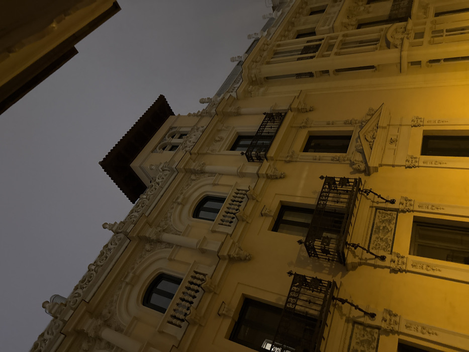 A low-angle shot depicts an ornate building facade at dusk. The building features arched and rectangular windows, some with black balconies. Intricate architectural details and decorative elements are highlighted by the lighting. The building appears to be cream or light yellow. Part of another building is visible in the upper left corner, adding to the urban context. The sky is a muted gray.