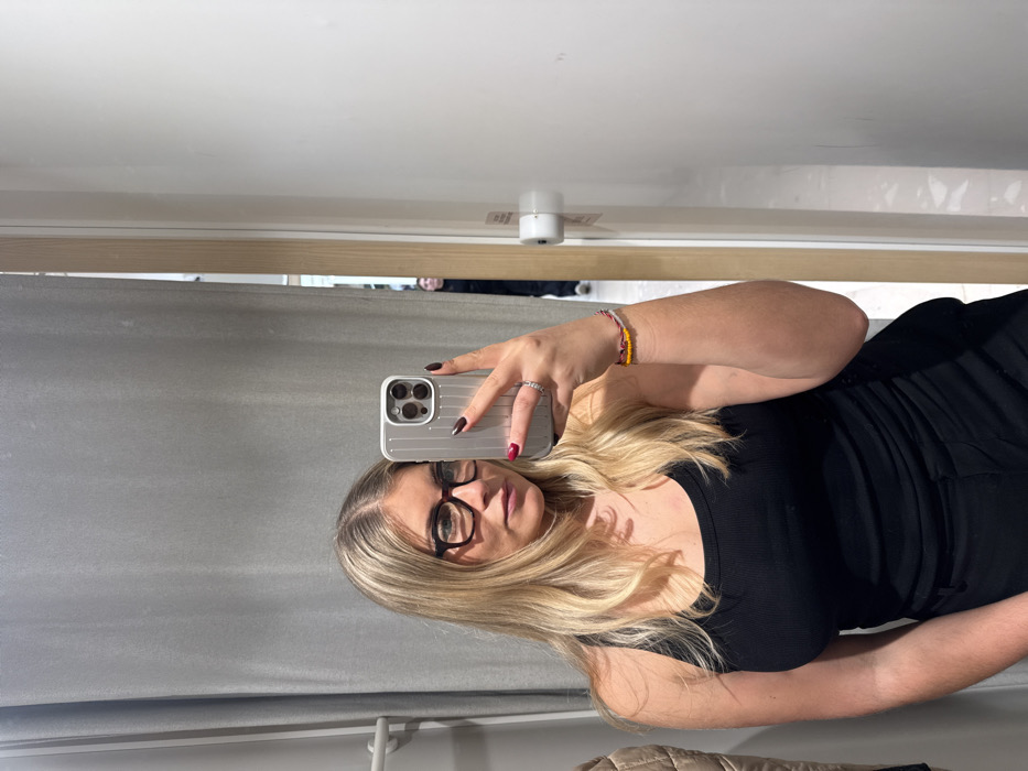 A blonde woman in a black dress takes a selfie in a dressing room. She wears glasses and holds a silver phone case. The dressing room has a gray curtain, a wooden frame, and a white ceiling with a small light fixture. Clothes hang behind the curtain. The image is rotated counter-clockwise.
