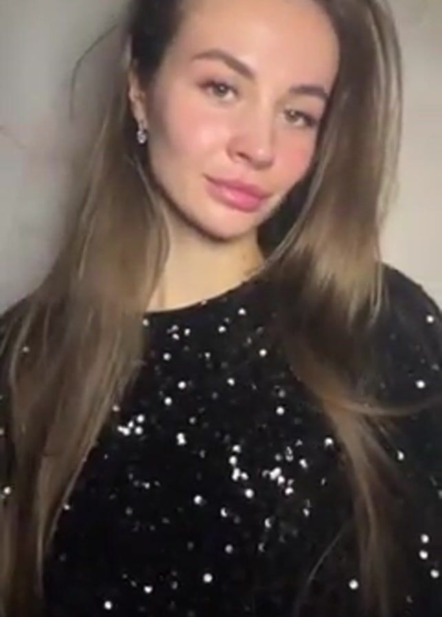 A woman is the subject of this close-up video. She possesses long, straight, light brown hair, fair skin, and visibly full lips. She wears a black, long-sleeved top adorned with sequins. Her hair is styled back from her face, and she is wearing stud earrings. The woman runs her hands over her neck and touches her forehead with her hand. The background is a light-colored, smooth wall.