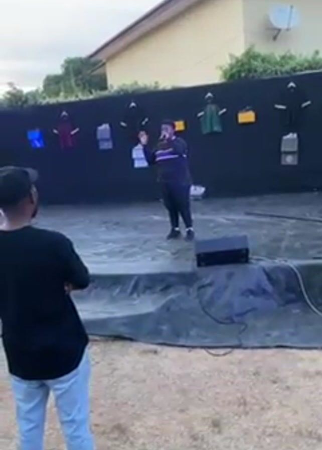 A man is rapping on a small, tarp-covered stage. The stage is outdoors, and behind it is a black backdrop with different colored garments and bags hanging on it. The man rapping is wearing black pants, a black and white track jacket, and black shoes. He is holding a microphone in his left hand and gesturing with his right. In front of the stage is a man wearing a black shirt, light blue jeans, and brown boots. He also has a black baseball cap on. He is standing with his arms crossed, watching the rapper. A building is visible in the background, along with some greenery. The sky is overcast. A speaker is on the stage near the front. A white wire is visible on the tarp. A few white chairs are to the left of the frame. The surface in the foreground appears to be dirt or gravel.
