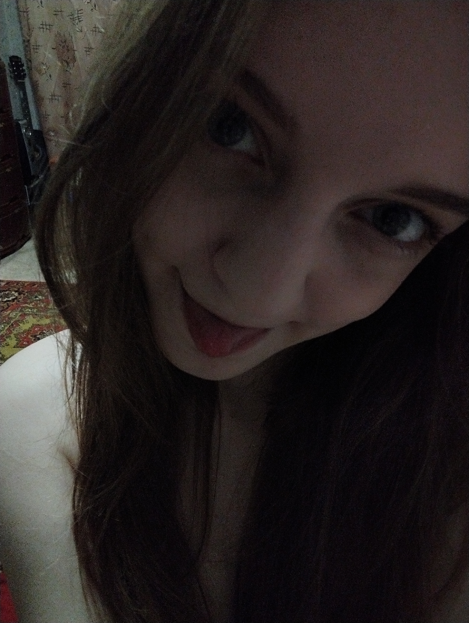 A dimly lit selfie of a young woman. She has long brown hair that falls to her shoulder and light skin. Her eyes are visible. She has her tongue slightly out. The background includes a portion of a wall covering, a partially visible musical instrument, and a rug. There is no information available to identify the specific location as Saratov, Russia.