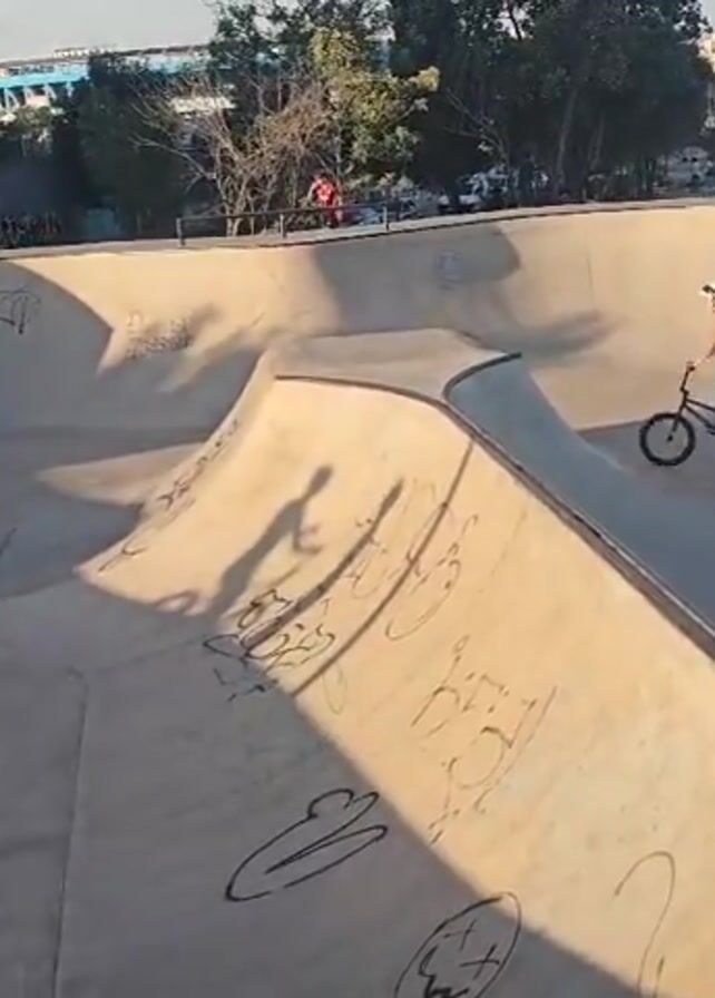 A person on a BMX bike rides through a concrete skatepark bowl. The bowl is covered in graffiti. The person rides up the ramps and along the edges of the bowl. Other people are visible in the background, both inside and outside the bowl. The skatepark is located in an urban area, with buildings and trees visible in the distance. The sky is clear.
