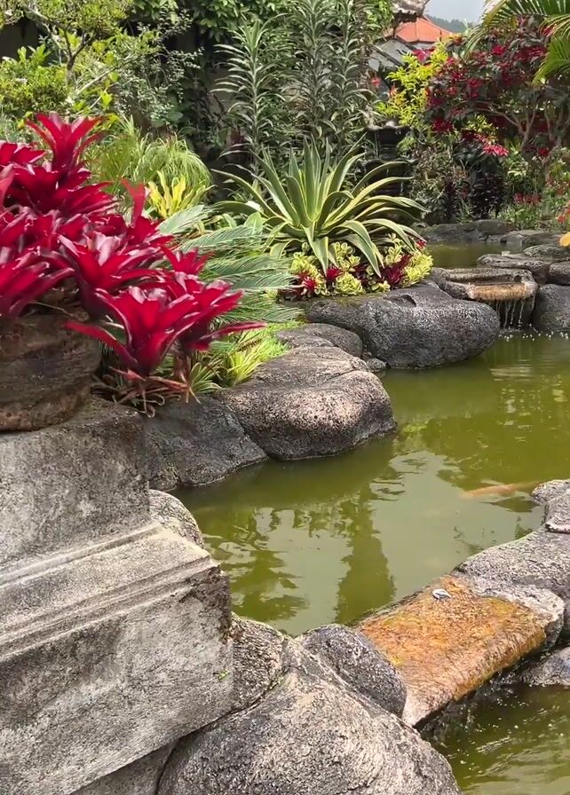 The camera pans upwards to show a pond surrounded by lush vegetation in a garden. The pond water is green in color and has rocks, plants, and decorative structures around its edge. There is a small waterfall feature, and the surrounding area is filled with a variety of tropical plants including red bromeliads, agave, palms, and flowering shrubs. The scene is well-maintained, and the environment is natural and peaceful. In the background, a glimpse of a building structure with a traditional roof and a satellite dish is visible, suggesting the location may be a residential or resort area.