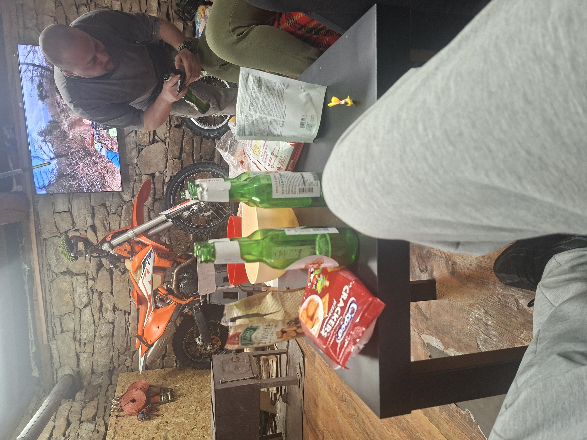 This image appears to be taken inside a room with stone walls, potentially a garage or workshop-like space. A motorcycle is propped up against the wall. Two individuals are present: one seated, opening a green beer bottle, and another individual mostly out of view. A black table is central in the frame, laden with objects including bags of chips, bottles of green beer, and other items. The environment is cluttered but suggests a casual, relaxed setting. There is a TV on the wall that is displaying an outdoor scene. There is no indication of the city of Balgarene, Bulgaria.