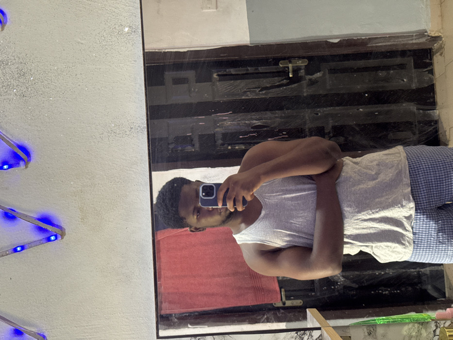 This image captures an indoor scene within the city of Asipa, Nigeria. A young adult male is depicted in a mirror selfie, viewed from the upper torso to the upper thighs, wearing a plain light grey tank top and blue and white checkered boxer shorts. He has dark, short, curly hair and dark skin. His arms are crossed, with his right hand holding a dark-colored smartphone, featuring a visible camera module, directly towards the mirror to photograph his reflection. The background, visible through the mirror, consists of a textured white wall with blue LED strip lights affixed across the top. To the left, a red towel hangs on a rack. To the right, a dark brown paneled door with a metallic handle is visible, alongside a section of a light-colored wall and an electrical fixture. A small portion of a light-colored countertop or shelf with minor objects is partially reflected in the bottom-left corner.