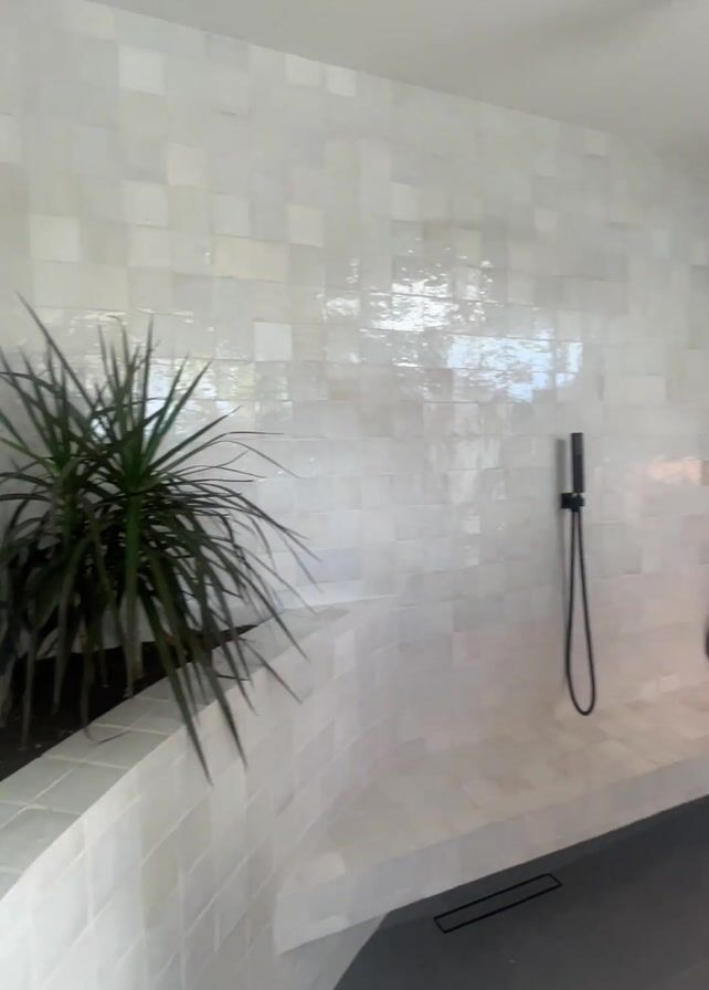 n indoor shower space. The walls are tiled in small, white, glossy square tiles. There is a built-in, curving bench, also tiled, with a planter containing a green plant to the left. Two black showerheads with matching hoses are mounted on the wall, and above them, two square black rainfall showerheads are installed in the ceiling. There is a small, illuminated niche in the wall to the right. The floor is dark gray. To the far right of the frame, a bamboo screen is partially visible. The video pans slowly across the scene.