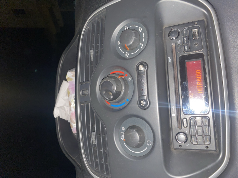 A car's dashboard shows climate controls and a radio. The climate control features three circular knobs: one for fan speed, one for temperature (marked with red and blue), and one for vent selection. An A/C button is visible. The radio displays "HITRADIO" and includes buttons for radio tuning, media selection (USB), and Bluetooth connectivity. Numbered buttons suggest preset stations. A partially visible tissue box sits beside the air vents.