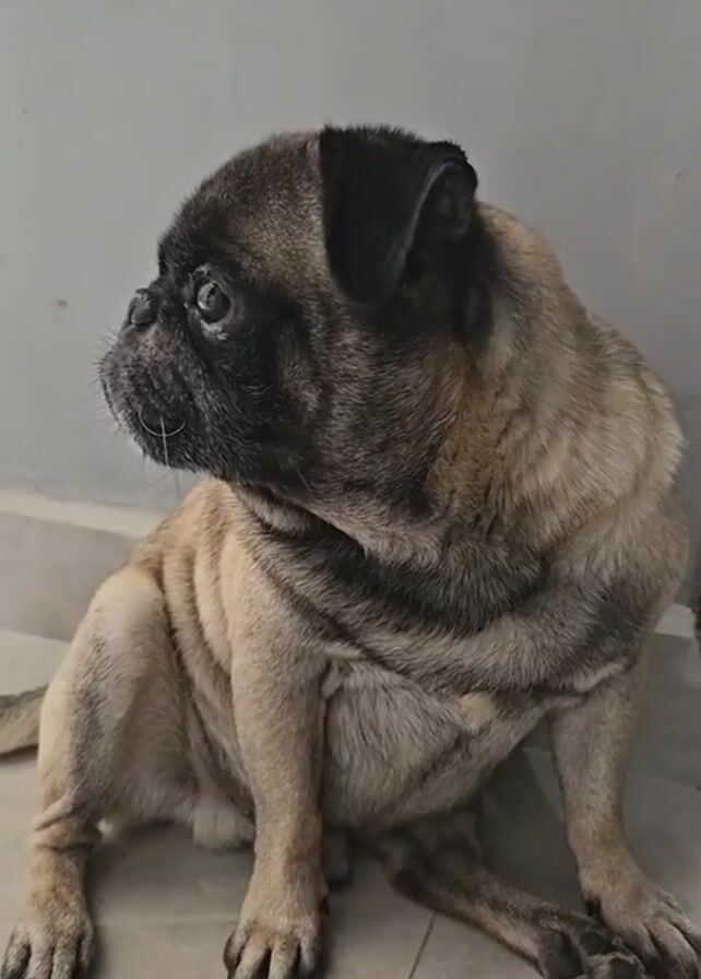 light brown and black pug sitting on a tile floor against a grey wall. The pug is looking off to the left side of the screen, then turns to face the camera directly.