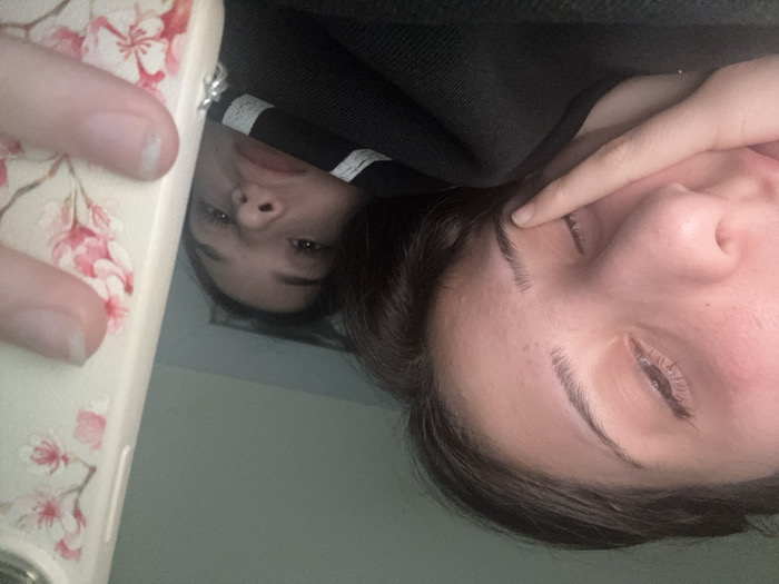 Two women appear in the photo, taken at an odd angle, as the subjects are sideways. The woman closest to the camera has her eyes closed, a finger touching her forehead. The other woman is partially obscured, but her face is visible, as is a black and white striped article of clothing. A floral patterned phone case occupies the far left of the frame. The background is a neutral, lightly colored wall.