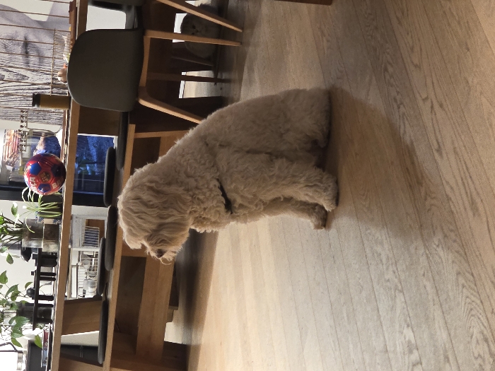 The image portrays an indoor domestic scene in Sant Cugat del Vallès, Spain. A light-colored, shaggy-coated dog, possibly a Poodle or similar breed, sits prominently on a light wooden floor in profile, facing the left side of the frame and wearing a dark collar. Its body casts a distinct shadow to its right. In the background, a sturdy wooden dining table or bench dominates the space, featuring a thick top and substantial legs. On the table's surface, multiple items are arranged: several green potted plants in clear containers, a dark decorative object, and a multi-colored red, blue, and yellow soccer ball bearing "FCB" branding. Dark, circular seat cushions are placed on a lower shelf or bench integrated into the table's structure. To the right of the table, two dark chairs with light wooden legs are partially visible. Underneath the table, between the chairs, a light-colored cat is partially obscured, positioned low to the ground. The background wall features a large, light-toned piece of art or a textured panel with a minimalist outline of a human face. No human subjects are depicted.