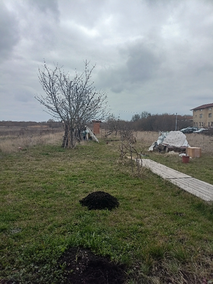 The image captures an outdoor scene within the city of Mramor, Bulgaria, under a heavily overcast, gray sky. The foreground features a sparse grassy area with patches of dry, light-brown vegetation. Two distinct mounds of dark, freshly disturbed earth are present in the lower left and central foreground. A rustic path constructed from parallel light-colored wooden planks runs diagonally from the lower right edge towards the center-right mid-ground. To the left of this path, a leafless deciduous tree with multiple slender trunks and branches stands prominently. Behind the tree, a small, reddish-brown brick structure, resembling an outbuilding or shed, is visible. Adjacent to the wooden path on the right, an accumulation of miscellaneous materials includes a large section of white, quilted insulation, various pieces of lumber, and other debris. A small red pot rests near this pile. The mid-ground extends into a field of dry, light-brown and green vegetation, interspersed with distant bare trees and brush. In the background, on the far right, a two-story building with a light-colored (possibly beige or light yellow) facade and a dark, possibly reddish-brown, roof is visible. Several vehicles are parked on a surface near this building. The horizon line is visible beneath the uniformly gray, cloudy sky. No individuals are present within the frame.